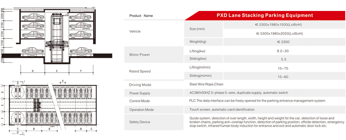 The lane stacking parking equipment is an intelligent system.Each system has a stacker that can slide horizontally on the track while it lifts.The car only needs to be pack into the entrance,the whole storage process will be completed automatically by the system,it is suitable for ground or underground parking of 2-8 layers.It quick and safe car access.